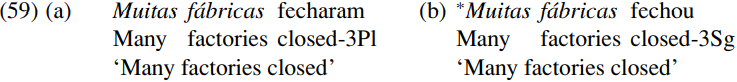 A key assumption underlying the analysis sketched here is that T triggers movement of a nominal goal with which it agrees in person and number. Interesting empirical support for this claim comes from European Portuguese. Costa (2001) notes that in colloquial Portuguese, an intransitive verb used in an unaccusative structure like that below can be either third person singular or third person plural if used with an in-situ postverbal argument as in (58) below: