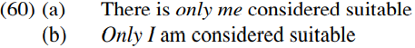 In (60a) the italicized pronoun expression follows the verb be, is not assigned nominative case, does not trigger T-agreement and is not raised to spec-TP; by contrast in (60b) the italicized nominal is assigned nominative case, triggers T-agreement, and is moved to spec-TP. Accordingly, sentences like (60) provide empirical support for Chomsky’s claim that there is a close association between case, agreement and A-movement.