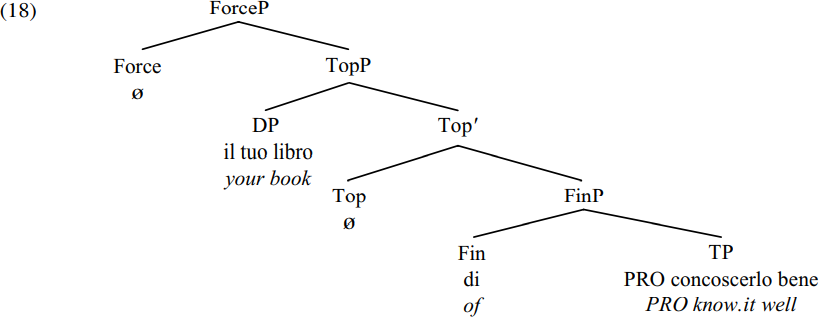 Under his analysis, il tuo libro ‘the your book’ is a topic and di ‘of’ is a Fin head which marks its clause as non-finite (more specifically, as infinitival). Moreover, Rizzi maintains that the Fin head di ‘of’ assigns null case to the PRO subject of its clause (an account of null case assignment in keeping with our account, but not with the Chomskyan account given).