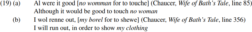 In (19a,b) the italicized expression is the direct object of the verb at the end of the line, but has been focalized/tropicalized and thereby ends up positioned in front of for. This is consistent with the possibility that for occupies the same Fin position in Middle English as di in Modern Italian, and that the italicized complements in (19a,b) move into specifier position within a higher Focus Phrase/Topic Phrase projection. Since the for infinitive complement in (19) has a null subject rather than an overt accusative subject, we can suppose that it is intransitive in the relevant use.