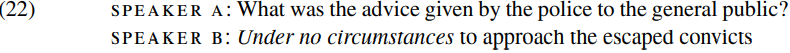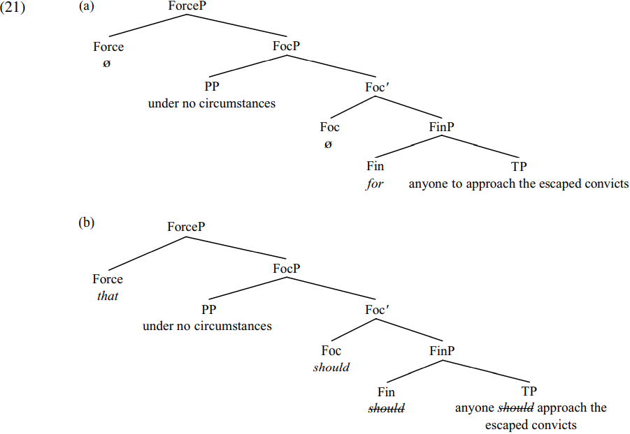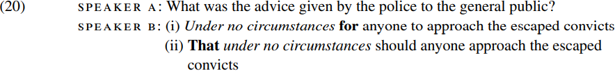 What is particularly interesting about speaker B’s replies in (20) is that the focused prepositional phrase under no circumstances precedes the complementizer for in (20Bi), but follows the complementizer that in (20Bii). This suggests that for occupies the head Fin position of FinP, but that occupies the head Force position of ForceP. On this view, the two answers given by speaker B would have the respective skeletal structures shown in (21a,b) below: