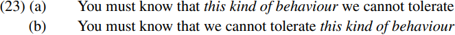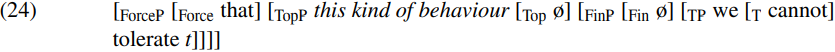 In (23a) the object this kind of behavior has been tropicalized, so forcing CP to split into three projections (ForceP, TopP and FinP) as shown in simplified form in (24) below: