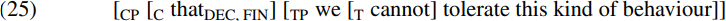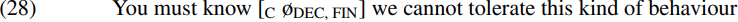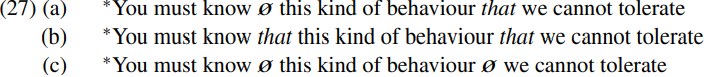 (Irrelevantly, (27c) is grammatical if written with a colon between know and this kind of behavior and read as two separate sentences.) It also means that the syncretized (force/finiteness) C constituent in (25) can either be spelled out as that in accordance with (26i), or be given a null spellout in accordance with (26ii) as in (28) below: