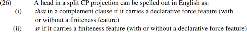 In other words, Rizzi’s analysis provides a principled account of the (overt/null) spellout of finite declarative complementizers in English (though see Sobin 2002 for complications). (Complementizer spellout may be different in other languages – see e.g. Alexopoulou and Kolliakou 2002 on Greek.)