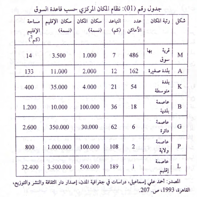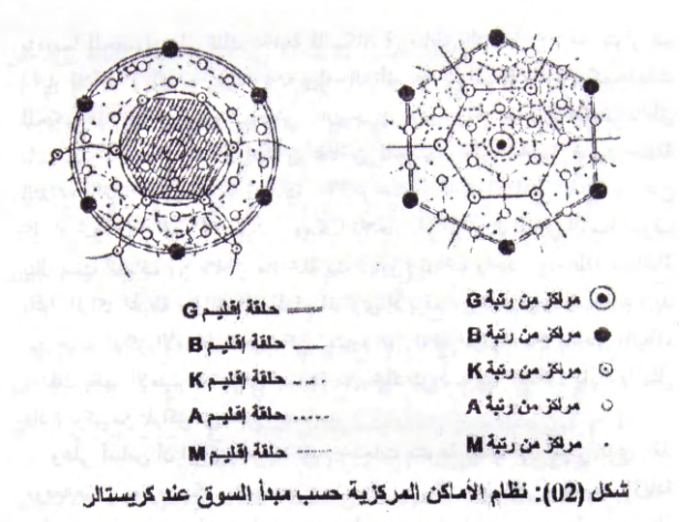 وفق هذا المبدأ يهيمن كل مكان مركزي رئيس على ستة أقاليم مركزية محيطة به. وقد حددت كل العناصر في الجدول رقم (01) أين ستكون قابلية المركز الأساسي على الجذب عالية فتتولد شتى علاقات الترابط المكاني بين المركز الرئيس والمراكز المحيطة به.