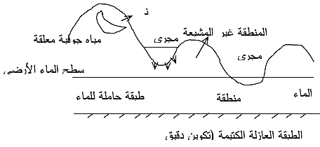 3- منطقة التهوية ( المياه المعلقة غير المشبعة) :Aeration zone, zone of suspended water unsaturated zone هذه المنطقة قريبة من سطح الأرض حيث أن المسامات ممتلئة جزئياً بالماء وجزئياً بالهواء؛ وتسمى المياه في هذه المنطقة بالمياه المعلقة أو ( مياه رطوبة التربة) soil moisture.
