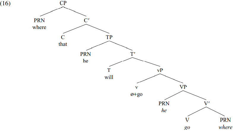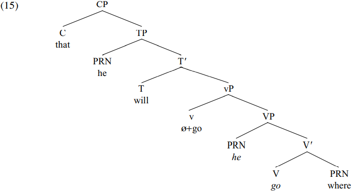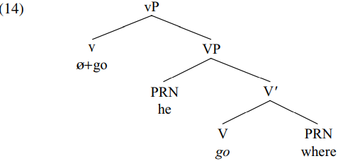 The derivation of (13) proceeds as follows. The unaccusative verb go is merged with its GOAL argument (the locative adverbial pronoun where) to form the V-bar go where, which in turn is merged with its THEME argument he to form the VP he go where. This in turn is merged with a null affixal light verb which triggers raising of the verb go to v from its original (italicized) position in V, so forming: