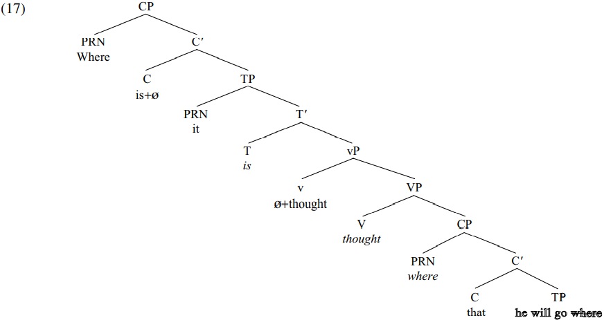 After transfer of TP is completed, the syntactic computation continues. The CP in (16) is merged as the complement of the verb THINK, and the resulting VP is in turn merged as the complement of a participial light verb (ensuring that think is eventually spelled out as the passive participle thought), with the verb THINK (below shown as thought) raising to adjoin to the light verb. The resulting vP is in turn merged as the complement of [T BE], which has an [EPP] feature that is deleted by merger of expletive it in spec-TP (it in turn serving as a probe valuing the agreement features of BE). Merging the resulting TP with a null affixal C will trigger raising of BE from its original (italicized) position in T to C; since C also has a wh-attracting [EPP] feature, it will trigger movement of where from the italicized spec-CP position in the complement clause into spec-CP position in the main clause, so deriving the CP shown in simplified form in (17) below: