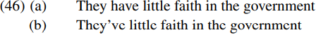 One such piece of evidence comes from observations about have-cliticisation. In varieties of English such as my own, have when used as a main verb marking possession can contract onto an immediately adjacent pronoun ending in a vowel or diphthong, e.g. in sentences such as (46) below: