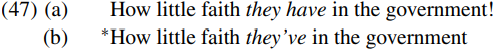 Since a finite T is generally able to attract possessive have to move from V to T, we might expect have to move from v to T at this point. But if have moves to T, it will then be adjacent to the subject they, leading us to expect have to be able to cliticise onto they in the PF component, so wrongly predicting that (47b) is grammatical. How can we prevent have cliticisation in such structures? One answer is to suppose that movement of have from v to T is blocked in structures like (48) by the intervening raised object how little faith in the outer spec-vP position. This would mean that the verb have remains in the head v position of vP rather than moving into T; and if have cannot move into T, it will not be adjacent to (and so cannot cliticise onto) the subject they in spec-TP. As should be obvious, this kind of account is crucially dependent on the assumption that the preposed wh-phrase how little faith moves through spec-vP before moving into spec-CP.