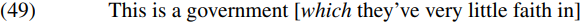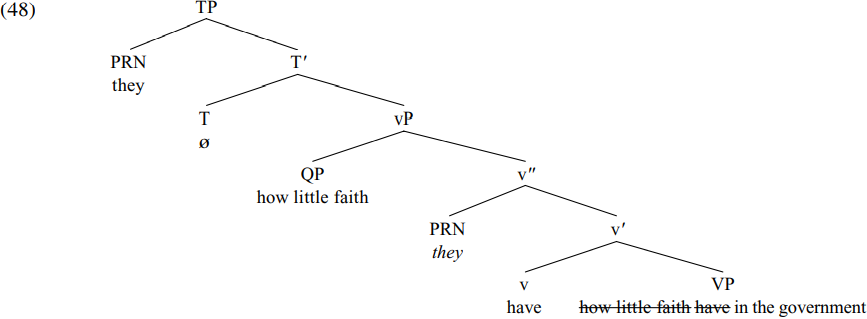 The verb have merges with the prepositional phrase in the government to form the V-bar have in the government. This is then merged with the QP how little faith to form the VP how little faith have in the government. The resulting VP is merged with a null light verb forming a v-bar which is in turn merged with its subject they, and the verb have raises to adjoin to the light verb. Being transitive, the light verb assigns accusative case to how little faith. Since a transitive light verb is a phase head, the light verb will carry [WH, EPP] features which trigger movement of the wh-marked QP how little faith to spec-vP. The resulting vP is merged with a T constituent which agrees with, case-marks and triggers movement to spec-TP of the subject they, so that on the TP cycle we have the structure shown in simplified form in (48) below: