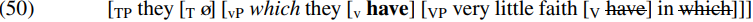 However, since which is not the object of have in (50) but rather is the object of the preposition in, it does not prevent have raising from v to T, and thereafter cliticising onto the subject they in spec-TP. So it would seem that (for reasons which are not clear) have is prevented from raising to T across its own object, but not across other intervening constituents.