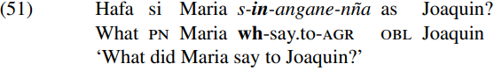 (PN denotes a person/number marker, AGR an agreement marker, and OBL an oblique case marker.) The crucial aspect of the example in (51) is that the direct object hafa ‘what’ has been moved out of the transitive verb phrase in which it originates, and that this movement triggers wh-marking of the italicized verb, which therefore ends up carrying the wh-infix in. This suggests that a transitive light verb carrying [EPP, WH] features attracts a wh-marked goal and undergoes agreement with the goal, resulting in the verb which is adjoined to the light verb being overtly wh-marked (though see Dukes 2000 for an alternative perspective on the relevant affixes in Chamorro). For further examples of wh-marking of intermediate verbs in long-distance wh-movement structures, see Branigan and MacKenzie (2002) on Innu-aimˆun, and den Dikken (2001) on Kilega.