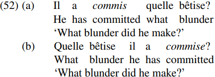 The participle commis ‘committed’ is in the default (masculine-singular) form in (52a), and does not agree with the feminine-singular in-situ wh-object quelle betise ˆ ‘what blunder’ (the final -e in these words can be taken to be an orthographic marker of a feminine-singular form). However, the participle commise in (52b) contains the feminine-singular marker -e and agrees with its preposed feminine-singular object quelle betise ˆ ‘what blunder’ and consequently rhymes with betise ˆ . What’s going on here?