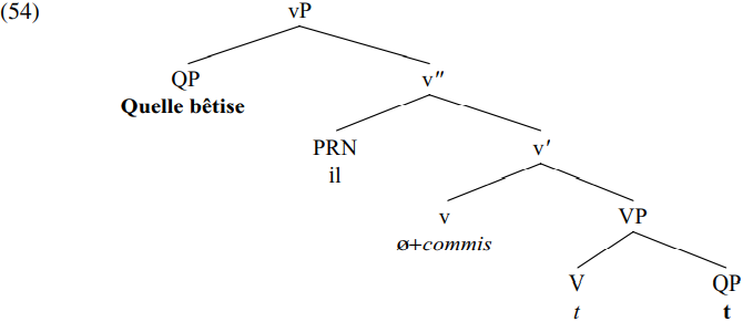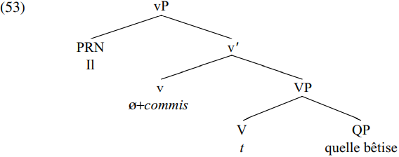 Let’s look first at the derivation of (52a). The QP quelle betise ˆ ‘what blunder’ in (52a) is merged as the complement of the verb commis ‘committed’ forming the VP commis quelle betise ˆ ‘committed what blunder’. The resulting VP is then merged with a null transitive light verb whose external AGENT argument is the pronoun il ‘he’; since the light verb is affixal, it triggers movement of the verb commis ‘committed’ to adjoin to the light verb, so that at the end of the vP phase we have the structure (53) below: