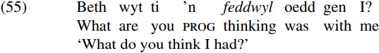 What is particularly interesting here is that the italicized verb has undergone soft mutation, so that in place of the radical form meddwyl ‘thinking’, we find the mutated form feddwyl. Given independent evidence that Tallerman produces in support of claiming that wh-traces induce mutation, an obvious way of accounting for the use of the mutated verb-form feddwyl ‘thinking’ in (55) is to suppose that the wh-pronoun beth ‘what’ moves through spec-vP on its way to the front of the overall sentence, in much the same way as what moves in front of think in (24) above. We can then suppose that a wh-trace on the edge of vP triggers soft mutation on the lexical verb adjoined to the light verb heading the vP. (See Willis 2000 for a slightly different account of Welsh mutation.)