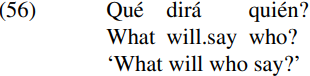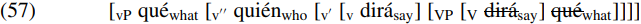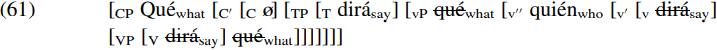 And (61) is the structure of (56) Que´ dira´ quien? ´ ‘What will who say?’ Note that a crucial plank in the argumentation is the assumption that a wh-object in a transitive clause like (56) moves to spec-CP through spec-vP. (However, see Fitzpatrick 2002, pp. 457–8 for discussion of a potential problem.)