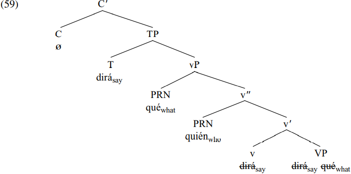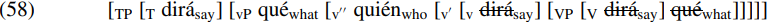 The resulting vP in (57) is then merged with an abstract T constituent, to form a TP. Given that Su˜ner (1994) argues that postverbal subjects in Spanish remain in situ within the verb phrase but that verbs move to T in finite clauses, we can assume that the verb dira´ ‘will.say’ moves from v to T, but the subject quien´ ‘who’ remains in situ in spec-vP, so that at the end of the TP cycle we have formed the skeletal structure: