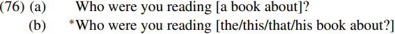 We could then say that extraction of who out of the bracketed indefinite DP in (76a) is permitted because indefinite DPs are not phases, whereas extraction of who out of the definite DP in (76b) is not permitted because definite DPs are phases, and the Phase Impenetrability Condition (1) prevents who from being extracted out of the NP book about who which is the complement of the head D of the bracketed definite DP. (It should be noted that Chomsky 1999, p. 36, fn. 28 envisages the possibility that ‘phases include DPs’.)