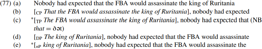 In (77b–e) a variety of constituents have been preposed to highlight them. In (77b) the fronted expression is a CP which functions as the complement of a non-phasal head (namely the verb expected) and can be preposed under appropriate discourse conditions. In (77c) the fronted constituent is a TP which is the complement of a phasal head (namely the complementizer that), and preposing the relevant TP violates the Phase Impenetrability Condition (1). In (77d), the fronted expression is a DP which is the complement of a non-phasal head (namely the verb assassinate), and hence there is no prohibition on extraction. But in (77e), extraction of an nP complement of the determiner the results in ungrammaticality: we can account for this if we suppose that definite DPs are phases, since the Phase Impenetrability Condition will prevent extraction of the nP king of Ruritania because this is the complement of the phase head the. The reason why the head of a phase does not allow extraction of its complement (or of any element contained within its complement) is that at the end of a phase, the complement of a phase head undergoes transfer in accordance with (7i) and thereafter becomes syntactically inactive.