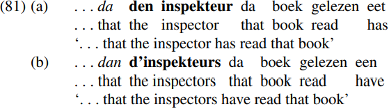 The italicized complementizer has the form da when the bold-printed subject is third person singular, but dan when it is third person plural. If the head C of CP can agree in person and number with the specifier of its TP complement in structures like (81), it seems no less plausible to suppose that the head D of DP can agree in wh-ness with the specifier of its NumP complement in structures like (79). This would mean that the overall DP would have a wh-marked head and hence could undergo wh-movement.