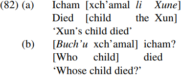 Some evidence which is consistent with the view that definite DPs are phases comes from observations about the pied-piping of possessive phrases in Tzotzil made by Aissen (1996). She notes that although (italicized) possessors are generally positioned postnominally in Tzotzil as in (82a) below, when the possessor is an interrogative pronoun, it is moved to the front of the DP containing it, and the whole containing DP is then moved to the front of the interrogative clause, as in (82b):