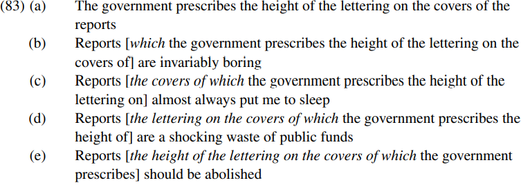 However, there are a number of problems which arise if we assume that definite DPs are phases. For example, Ross (1967) noted that corresponding to a sentence like (83a) below, we find a range of types of relative clause including like those bracketed in (83b–e):