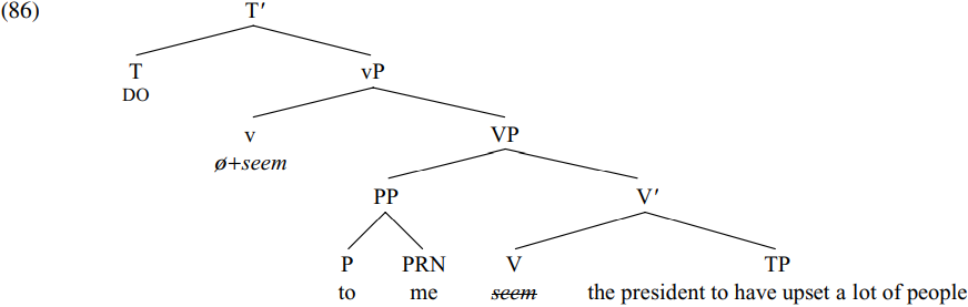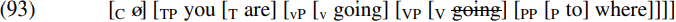 Suppose we follow Chomsky in assuming that intransitive light verbs do not have an [EPP] feature triggering wh-movement, and suppose that we have reached the stage of derivation shown in simplified form in (93) below: