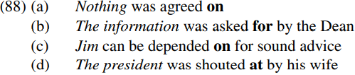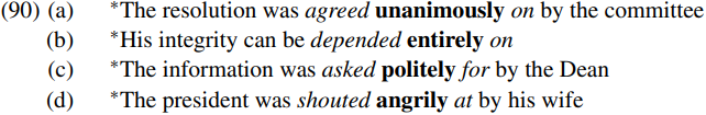 Not necessarily. Radford (1988, pp. 427–32) argues that in prepositional passives like those in (88) above the preposition is adjoined to the verb (forming what pedagogical grammars of English sometimes call a phrasal verb). Part of the evidence in support of such an analysis is that it correctly predicts that no other (bold-printed) constituent can be positioned between the (italicized) verb and preposition in prepositional passives like (90) below: