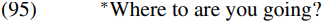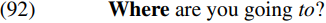 Structures like where to? may provide us with some evidence in support of supposing that prepositions can have an [EPP] feature triggering movement of a wh-expression to spec-PP (though it should be noted that structures like (96B) are subject to strong constraints on the choice of wh-word and preposition: see Radford 1993 for some discussion). A final point to note about prepositions with wh-complements is that if we assume that P does not have an [EPP] feature in those languages and language varieties which do not allow preposition stranding (e.g. formal styles of English), we can account for why sentences like (92) are not grammatical in the relevant languages/varieties.