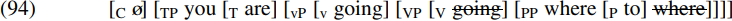 Once again, not necessarily. After all, a phase head like C can have an [EPP] feature permitting a wh-expression to move into spec-CP, and then be attracted by a higher head. Suppose, therefore, that in colloquial English, a preposition can carry an [EPP] feature. If this is so, the wh-word where can move to spec-PP in (93), so that at the stage when C is introduced into the derivation, we will have the structure (94) below (if we follow Chomsky in assuming that intransitive verb phrases are not phases):