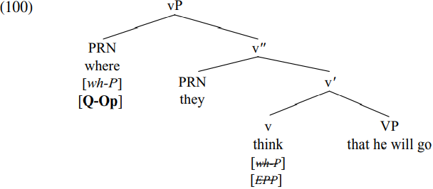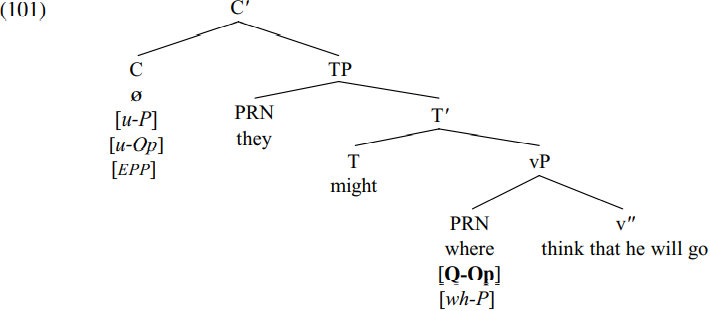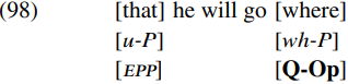 Assume that the derivation proceeds as discussed in relation to (13) Where is it thought that he will go? until we reach the stage of derivation when the complementizer that merges with its CP complement to form that he will go where (whose structure is shown in (15) above). Let’s suppose that a wh-word contains an interpretable operator feature marking whether it is a question operator, a relative operator, or an exclamative operator, so that interrogative wh-words have the interpretable feature [Q-Op] ‘question operator’. Let’s further suppose (again following Chomsky) that wh-words also have an uninterpretable wh-feature which makes them active: since this is a P-feature (i.e. a peripheral feature associated with movement to the periphery of a phase) in Chomsky’s terms, let’s denote the relevant feature as [wh-P]. In addition, we can take the complementizer that in (97) to have an [EPP] feature and contingent on this (to use Chomsky’s phrase) a ‘non-specific P-feature’. Let’s take the relevant P-feature to be an uninterpretable.