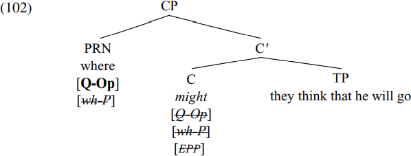 C is an active probe by virtue of its uninterpretable (and unvalued) peripheral and operator features, and locates where (which is active by virtue of its uninterpretable wh-feature) as a matching active goal. Where values the unvalued peripheral and operator features of C as [wh-P] and [Q-Op] respectively, and simultaneously deletes them (because where is complete by virtue of having both a P-feature and an O-feature). Since C is also complete, C can delete the wh-P feature of where (making it ineligible to serve as a goal for any other probe). The [EPP] feature of C is deleted by moving where into spec-CP. Since the null complementizer ø carries an affixal tense feature (not shown above), it triggers raising of the auxiliary might from T to C, so deriving the overt structure shown in highly simplified form in (102) below: