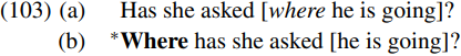 In (103), both the main clause and the bracketed complement clause are interrogative in nature and hence contain a C with (initially unvalued) O- and P-features. Accordingly, movement of where to become the specifier of the bracketed complement clause in (103a) will result in the wh-feature of where being inactivated by the null C heading the bracketed complement clause, since the complement clause C is complete by virtue of carrying O- and P-features. Hence, once where moves to the italicized spec-CP position within the bracketed clause in (103a) its [wh-P] feature is deleted, making it inactive and hence unable to subsequently move into the bold-printed spec-CP position in the main clause in (103b).