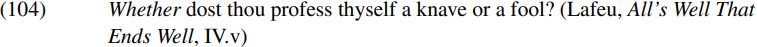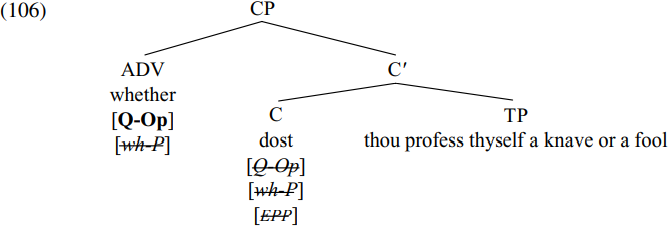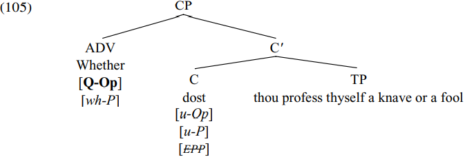 As desired, the only undeleted P-feature which survives at the end of the CP phase is the interpretable operator feature of whether. It may be that whether gets interpreted as a yes–no question operator because (unlike other wh-operators) it does not bind a trace (i.e. variable) – or its yes–no question interpretation may simply be part of the meaning of whether. We can suppose that yes–no questions in present-day English have a similar derivation, save that whether receives a null spellout in main clauses, in keeping with Rizzi’s (2000) hypothesis that root specifiers in certain types of structure have a null spellout under appropriate conditions. (Note that the analysis of yes–no questions outlined above assumes that C in yes–no questions has the same feature composition as in wh-questions and hence has uninterpretable [Q-Op] and [wh-P] features. However, an alternative possibility is that C in yes–no questions may contain an interpretable operator feature, but no [wh-P] feature: such an analysis would obviate the need for positing a null variant of whether in spec-CP in main-clause yes–no questions in English.)