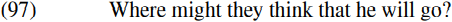 In the semantic component, a CP containing an interrogative operator in spec-CP will be interpreted as interrogative, and so (102) will receive an interpretation which can be loosely paraphrased as ‘What is the place such that they might think that he will go there?’, with where interpreted as an operator which binds a theta-marked trace in VP-complement position (the trace not being shown in (102) above).