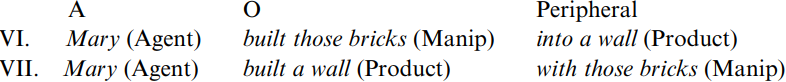 That role out of Manip and Product which is the focus of attention is placed in O relation. Construction VI directs attention to ‘those bricks’, which may have been left over from another job so that Mary wondered what to do with them—then she hit upon the idea of building them into a wall. Construction VII is concerned with ‘a wall’, which was perhaps badly needed; it is likely that sufficient bricks were purchased to build it.