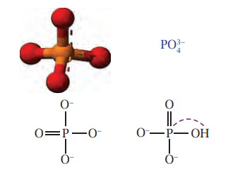 شكل 14-8: في جزيئة الفوسفات –3P04 ترتبط ذرة P مع 4 أيونات أوكسجين بشكل هرم رباعي. في درجة الحموضة الفسلجية 7=pH يرتبط بروتون واحد أو اثنان مع أيون الفوسفات. يتآثر البَرم المغزلي النووي للبروتون المرتبط مع البرم المغزلي النووي لذرة P31 ويفك تماسكه. عن: (2017) Fisher.