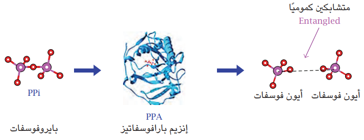 وحيث إن التشابك الكمومي هو متطلب مركزي في عملية المعالجة الكمومية، فقد اعتقد الباحث أن الإنزيم الذي يحفّز التفاعل الكيميائي الذي يشطر أيون البايروفوسفات (Pyrophosphate) إلى أيوني فوسفات يمكن أن يُشابِك كموميا زوجا من الكيوبتات (شكل 14-11).