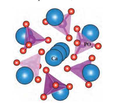 شكل 14-10: في جزيئة بوزنر Ca9(PO4)6 تقع 8 من أيونات الكالسيوم (الأزرق) على حواف المكعب والتاسع في المركز، بينما تقع 6 من أيونات الفوسفات (ذرات الفسفور باللون البنفسجي محاطة بأربع من ذرات الأوكسجين باللون الأحمر) على الوجوه الستة للمكعب. عن: (2017) Fisher.
