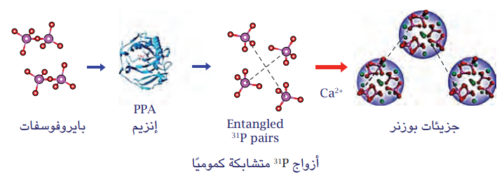شكل 14-11: بعد التحلُّل المائي لجزيئات البايروفوسفات، يمكن لأيونات الفوسفات (بالبرم المغزلي النووي المتشابك لأزواجها) أن تتحد مع أيونات الكالسيوم لتكوين جزيئات بوزنر. هذا يمكن أن يُوجد لفا مغزليًّا نوويا متشابكا كموميًّا ضمن وما بين الجزيئات. محور عن: (2017) Fisher.