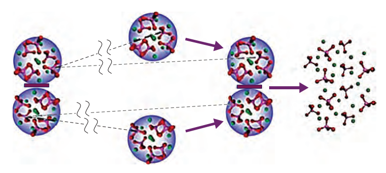 شكل 14-12: مع بطء الدوران، ينفك زوج جزيئتي بوزنر المرتبطتين بسهولة أكثر (في بيئة حامضية قليلا) من الجزيئات المفردة، وهكذا يتحلَّل زوج بوزنر إلى مكوناته من أيونات الكالسيوم والفوسفات. أيونات الكالسيوم المتحرّرة يمكن أن تقدح عمليات كيموحيوية لتوصيل الوضع الكمومي إلى كيموحيوي. عن: (2017) Fisher.