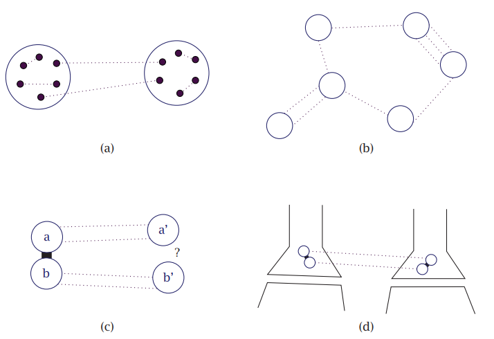 شكل 14-13: زوج من جزيئات بوزنر المتشابكة في (a). الخطوط المتقطعة البنفسجية تمثل الحالة المنفردة (Singlet) للفّ المغزلي النووي المتشابك للفسفور. معقد من جزيئات بوزنر عالي التشابك في (b). مع زوجين من جزيئات بوزنر المتشابكة موسمة (a , a') و (b' b ,) كما في (c) ارتباط كيميائي بين واحد من كل زوج مع الآخر – المستطيل الأسود الذي يربط (a , b) – يمكن أن يغيّر احتمالية الارتباط التالي لفردَي الزوج الآخرين (a' , b'). إذا ارتبطت جزيئات بوزنر كيميائيا بعد انتقالها إلى اثنين من الخلايا العصبية قبل المشبك كما في (d) فستكونان عرضةً للتفكُّك محرِّرتين أيونات الكالسيوم المصاحبة لهما في السايتوبلازم، وهذا يحفز تحرُّر ناقل عصبي، وبذلك تُحفّز إطلاق متشابك كموميًّا للخلية العصبية بعد المشبك. عن: (2015) Fisher.