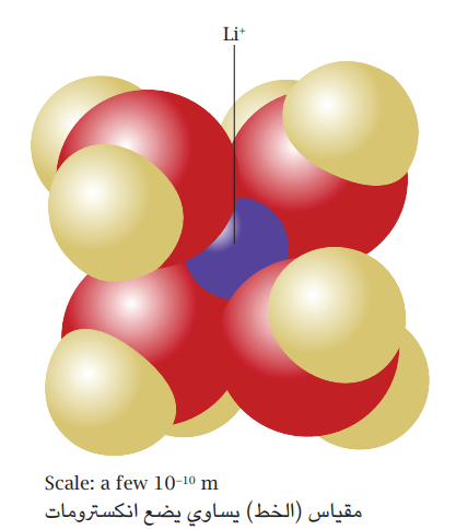 شكل 14-14: يكون أيون الليثيوم في المحلول المائي معقدًا رباعي السطوح 4(Li+(H2O. يقع أيون الليثيوم (بنفسجي) في المركز ويُحاط بأربعة جزيئات ماء. الأوكسجين (أحمر) والهيدروجين (أبيض). مُحوّر عن McCoss (2017) https://chem.libretexts.org.
