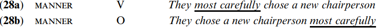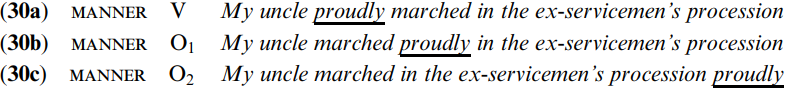 There is a subtle difference between (30b) and (30c). Using proudly in position O1, in (30b), simply states that my uncle marched proudly (maybe he always does). On the other hand, (30c), with the adverb in position O2, implies that what he did in a proud way was march-in-the-ex-servicemen’s-procession, probably because he greatly values being an ex-serviceman. That is, the adverb has scope over all that precedes.