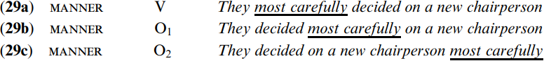 Now, I mentioned that English has a number of transitive verbs which include an inherent preposition; these include rely on, hope for, refer to and decide on; a two-word unit such as decide on behaves in many ways like a one-word lexeme such as choose. Now consider where the complex manner adverb most carefully can occur in the sentence They decided on a new chairperson: