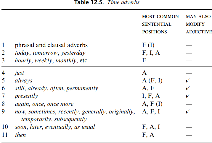 Set (10) covers a number of adverbs which may again function in all three positions but, unlike set (9), do not modify an adjective. It includes soon, the derived form eventually and the phrasal form as usual. Interestingly, soon appears to be most at home later in the clause; He’ll weed the garden soon sounds more felicitous than He’ll soon weed the garden. The time adverb late is generally used in F position; however, comparative form later can be used with a non-comparative meaning, in place of late, and may then occur in any of the three positions (although F is most favored).