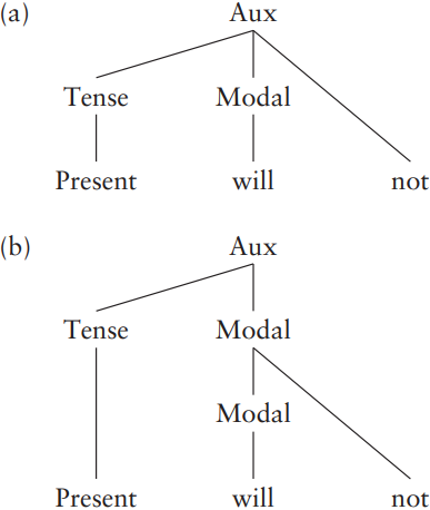 A basic SYNTACTIC operation in TRANSFORMATIONAL GRAMMAR (TG) referring to a RULE which places certain ELEMENTS of STRUCTURE in adjacent positions, with the aim of specifying how these structures fit together in larger units. In classical TG, several types of adjunction were recognized. In sister-adjunction two elements were formally adjoined under a particular NODE and thus became sister CONSTITUENTS of that node. For example, in one formulation of the VERB PHRASE, the NEGATIVE PARTICLE was ‘sister-adjoined’ to the elements MODAL and TENSE, as in (a) below. (A different, but related, formal operation was known as daughter-adjunction.) Chomsky-adjunction provided an alternative way of handling this situation, and is now the only type of adjunction recognized in GOVERNMENT-BINDING THEORY. This suggestion involves adjoining an element to a node: a COPY of this node is then made immediately above it, as in (b) below. Each of the nodes in Chomskyan adjunction structure is called a ‘segment’, and the two together are called a ‘category’. In (b), each of the Modals is a segment, and the category Modal is a combination of the two. A category can, but a segment cannot, DOMINATE. This ensures that whatever happens to modal will also happens to not – for instance, CONTRACTED not (n’t) needs to stay with the modal if the latter is moved, as in won’t he, can’t he, etc. It is thus claimed that this operation allows LINGUISTICALLY SIGNIFICANT GENERALIZATIONS to be made which might otherwise be missed, or which would be handled less ECONOMICALLY. In government-binding theory, MOVEMENT rules involve either (Chomsky-) adjunction or SUBSTITUTION.