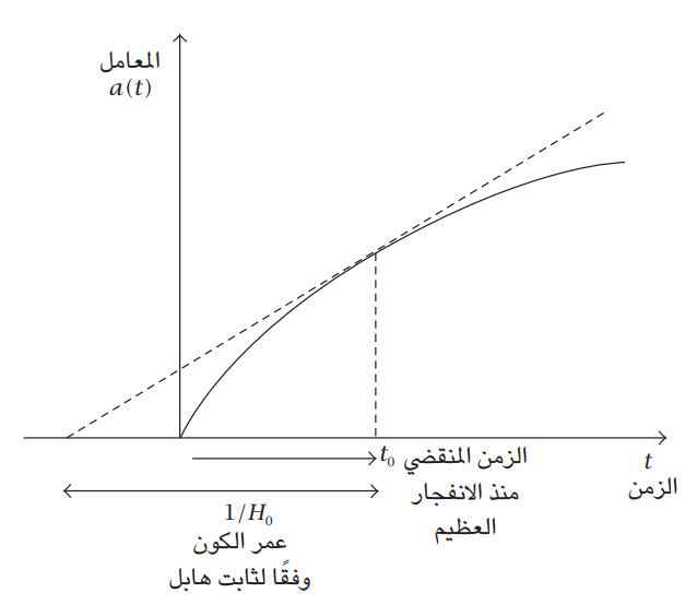 شكل 7: عمر الكون. سواء أكان الكون منبسطاً أم مفتوحا أم مغلقًا، فإن نماذج فريدمان دائما ما تتباطأ. هذا يعني أن عمر الكون وفقًا لثابت هابل H0/1، يتجاوز دائما الزمن الفعلي المنقضي منذ الانفجار العظيم (t0).