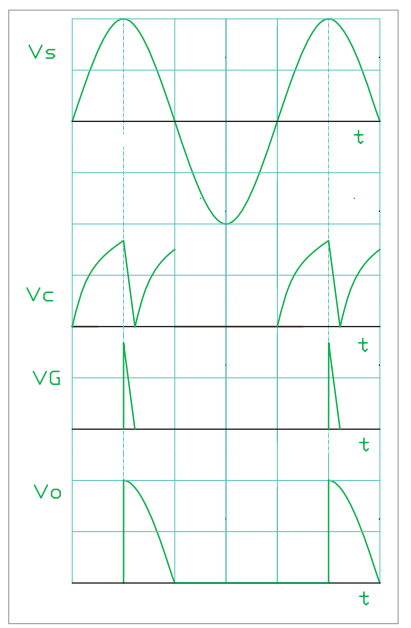 تتكون دارة القدح من مذبذب تراخ يستخدم ترانزستوراً أحادي الوصلة المبرمج، في النصف الموجب لموجة التغذية يعمل ثنائي الزينر على تحديد جهد الشحن على قيمة جهد الزينر VZ المستخدم، ويتحدد جهد البوابة للترانزستور بواسطة مجزئ الجهد